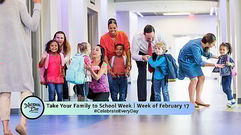 Take Your Family to School Week happens during the week of February 17 each year. This weekly observance is a unique opportunity to connect families with their children's school experiences. The observance is a PTA program designed to bridge the gap between home and school.