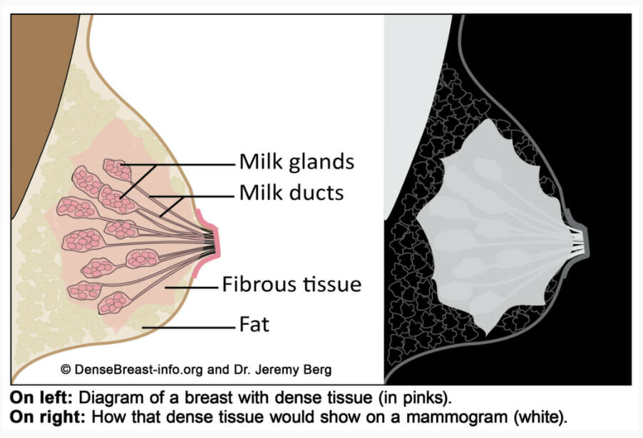 Breasts are made of fat and glands (that make milk) held together by fibrous tissue. Each woman has a unique mix of fatty and dense (glands and fibrous) tissue in her breasts. Furthermore, the more glands and fibrous tissue that a woman has, the “denser” her breast tissue. Almost half of the women over the age of 40 have dense breasts. However, the denser the breast tissue, the greater the chance that a cancer will be missed. Unfortunately, a woman’s risk for breast cancer increases with the level of density in her breast.